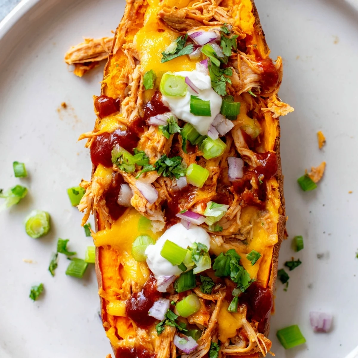 These BBQ chicken stuffed sweet potatoes combine tender roasted sweet potatoes with smoky, saucy shredded chicken and melted cheddar cheese. The natural sweetness of the potatoes perfectly balances the tangy barbecue flavor, while fresh toppings like green onions, red onion, and herbs add brightness and crunch. Ready in just over an hour with mostly hands-off cooking time, this dish delivers maximum satisfaction with minimal effort. Perfect for busy weeknights when you want something hearty and comforting that feels special yet comes together easily.