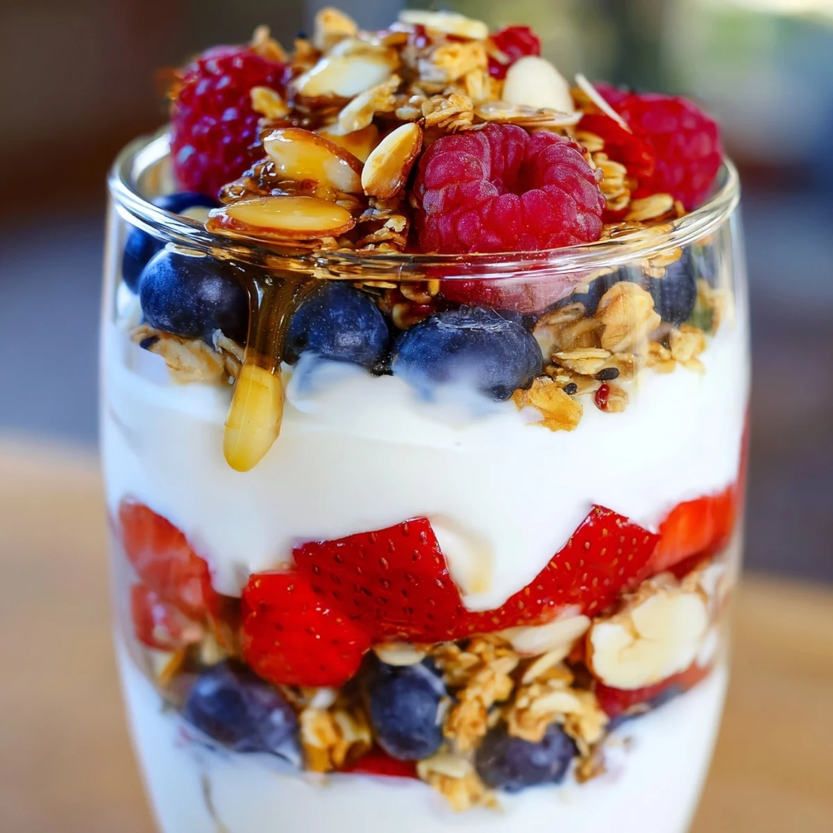 - Greek yogurt: The thick texture holds up beautifully between layers, and the tang balances the sweet fruit and honey