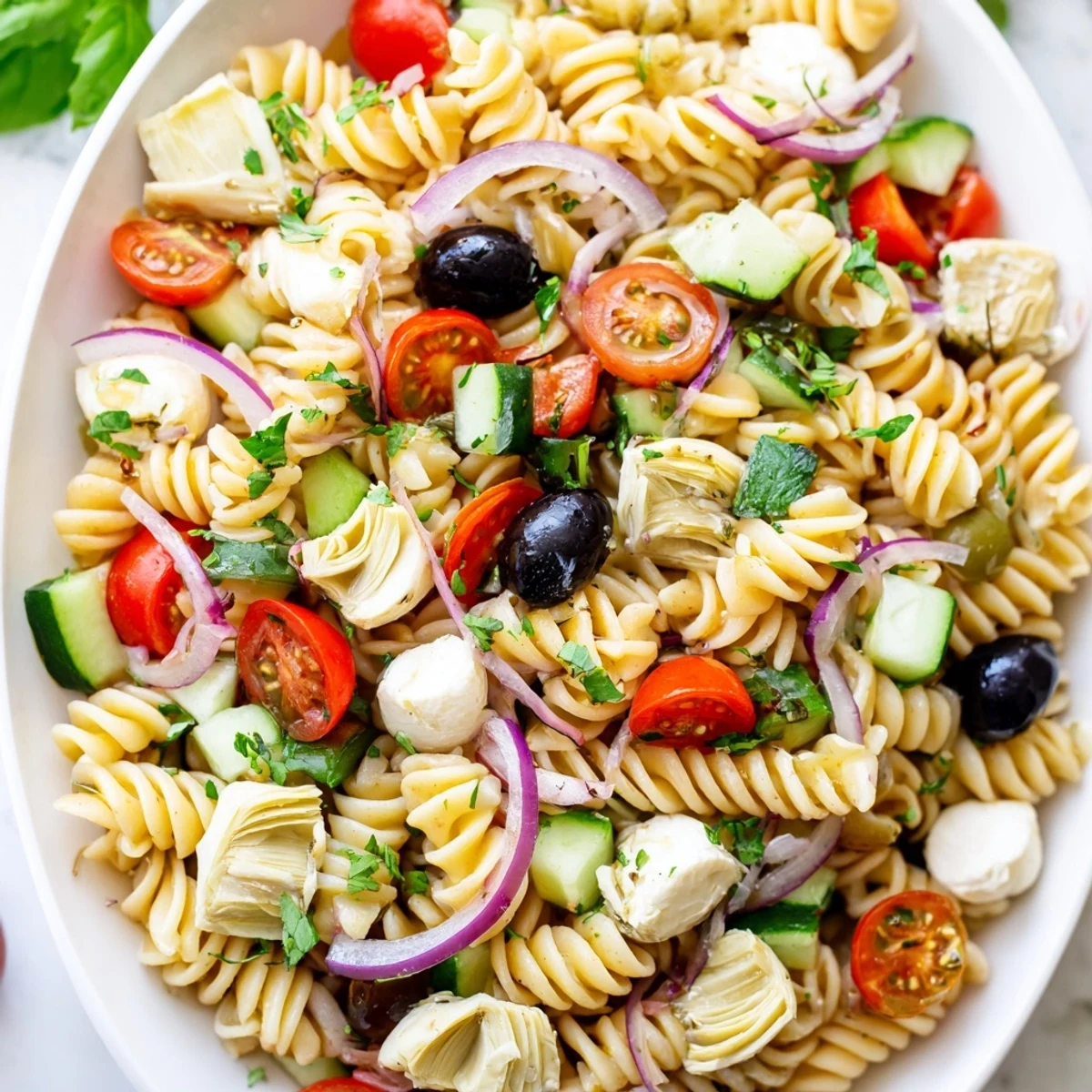 This colorful pasta salad combines al dente fusilli with crisp cherry tomatoes, refreshing cucumber, sweet red bell pepper, and savory black olives. Fresh mozzarella adds creaminess while basil and parsley bring bright herb flavors. The zesty dressing features extra-virgin olive oil, red wine vinegar, and garlic.