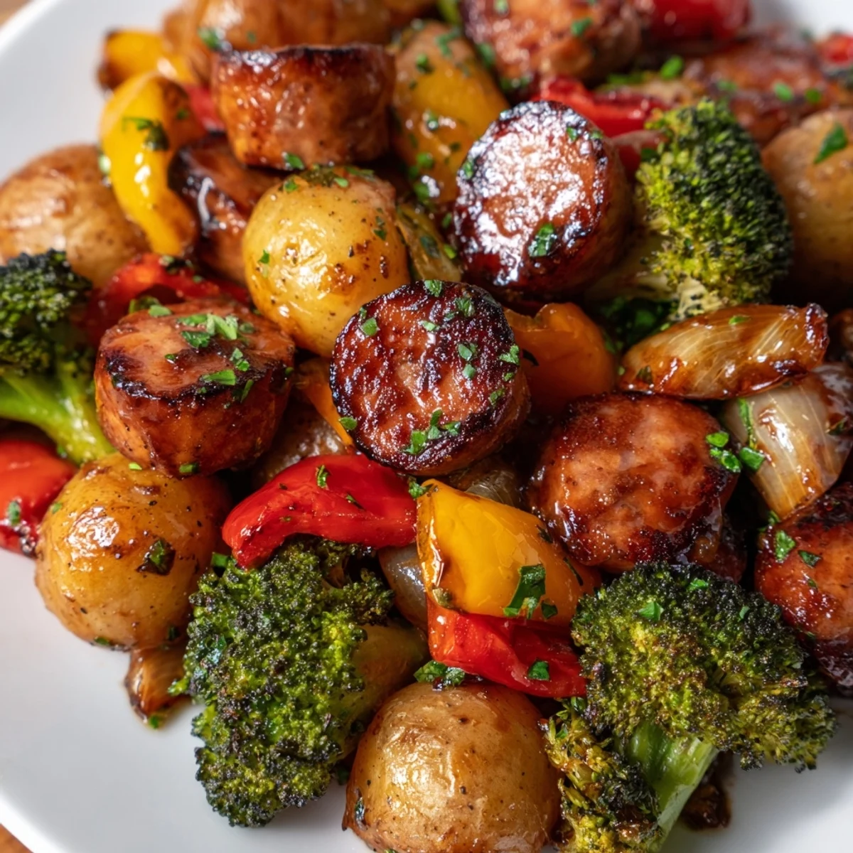 This hearty sheet pan dinner combines sliced kielbasa sausage with baby potatoes, broccoli florets, bell peppers, red onion, and carrots. Everything roasts together with a simple honey garlic glaze made from honey, olive oil, fresh garlic, soy sauce, and Dijon mustard. The result is tender, caramelized vegetables with perfectly browned sausage coated in a sweet-savory finish. Prep takes just 15 minutes, then let the oven do the work while flavors meld together.